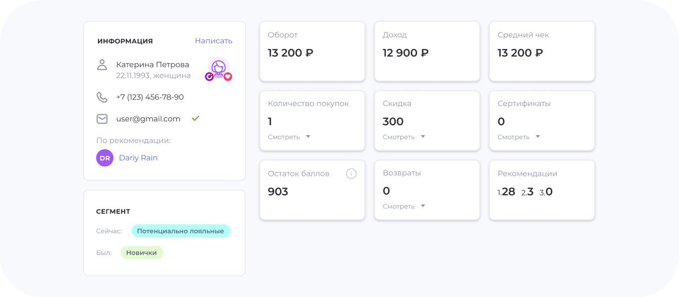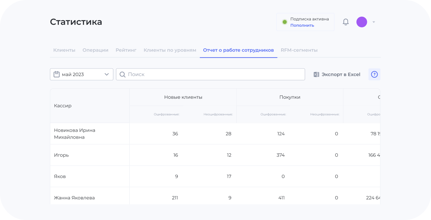 Клиентская база заполняется автоматически при использовании программы лояльности. Оцифрованная клиентская база позволит анализировать и сегментировать ваших клиентов. Вы всегда можете выгрузить её в виде excel-файла.