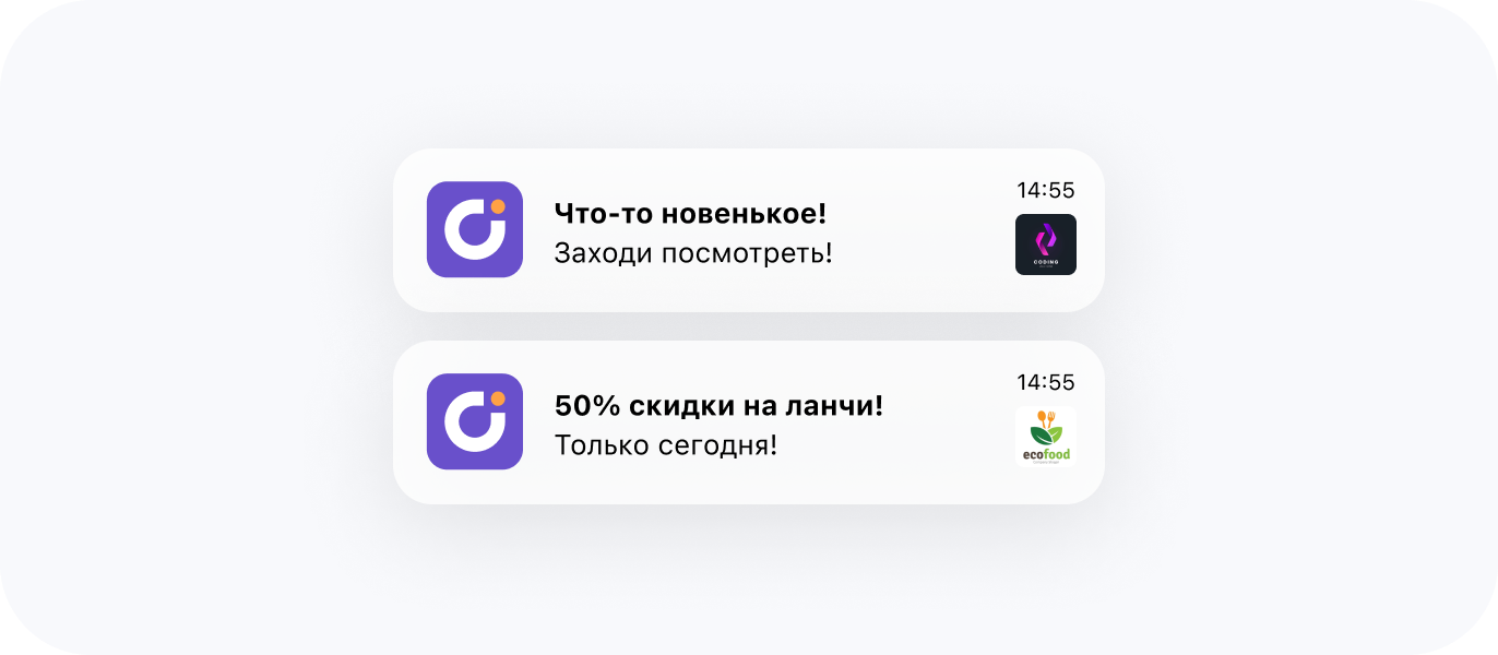 С push-уведомлениями ваши клиенты мгновенно узнают о ваших предложениях, новостях и акциях. Вы сэкономите бюджет на sms и email-рассылках и создадите имидж современной и продвинутой компании. В отличие от sms, push-уведомления бесплатны. Выглядят они более информативно и привлекательно.