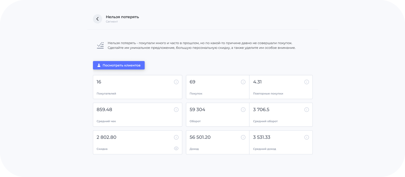 С помощью RFM-сегментов вы сможете выявить группу клиентов, которая находится в зоне риска оттока. Такая группа может быть выделена, после чего можно строить индивидуальные коммуникации: постоянным клиентам отправлять специальные предложения, а пользователям, которые давно не покупали, предоставлять мотивирующую скидку.