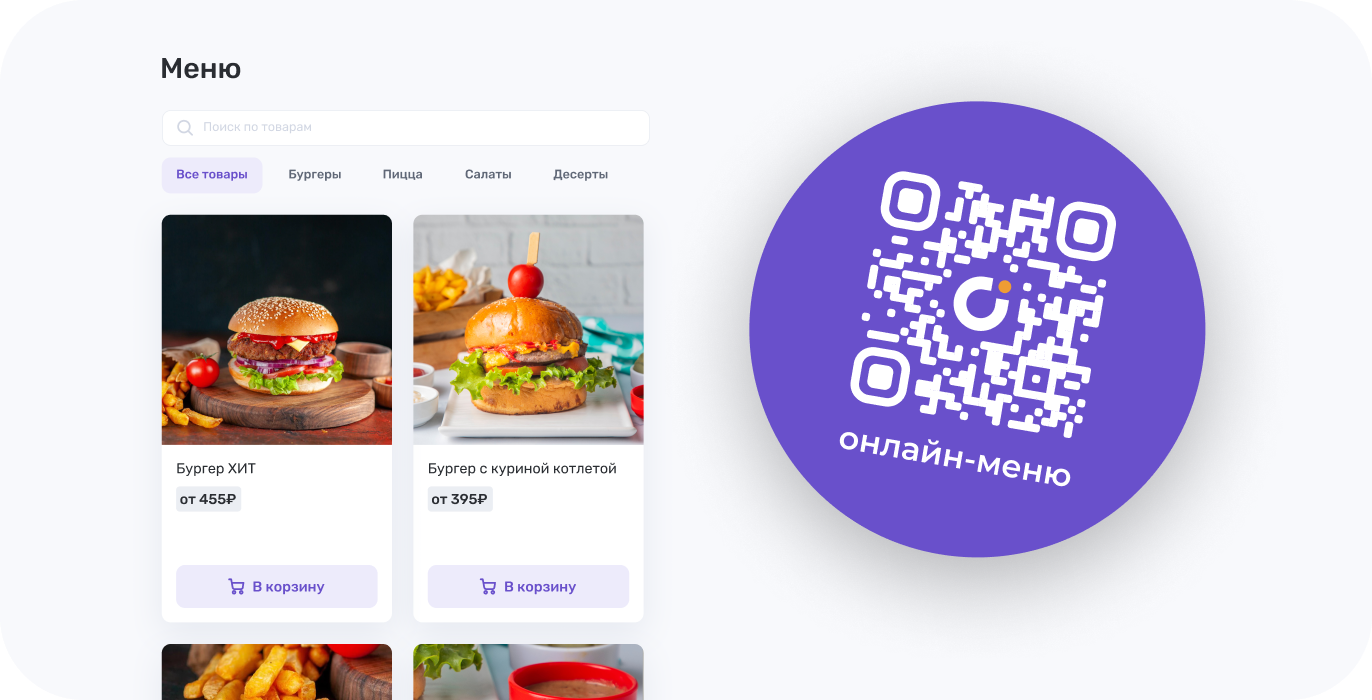 Добавьте свои товары в каталог, сгенерируйте QR-код и предоставьте вашим клиентам доступ к красиво оформленному меню вашего заведения.