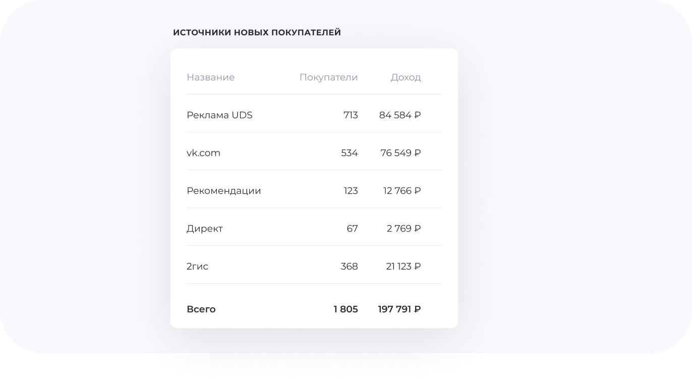 Модуль «Источники трафика» — это удобный способ отслеживать откуда в ваше заведение идет поток клиентов. Вы сможете оценить эффективность каналов привлечения трафика и снизить затраты на маркетинг.