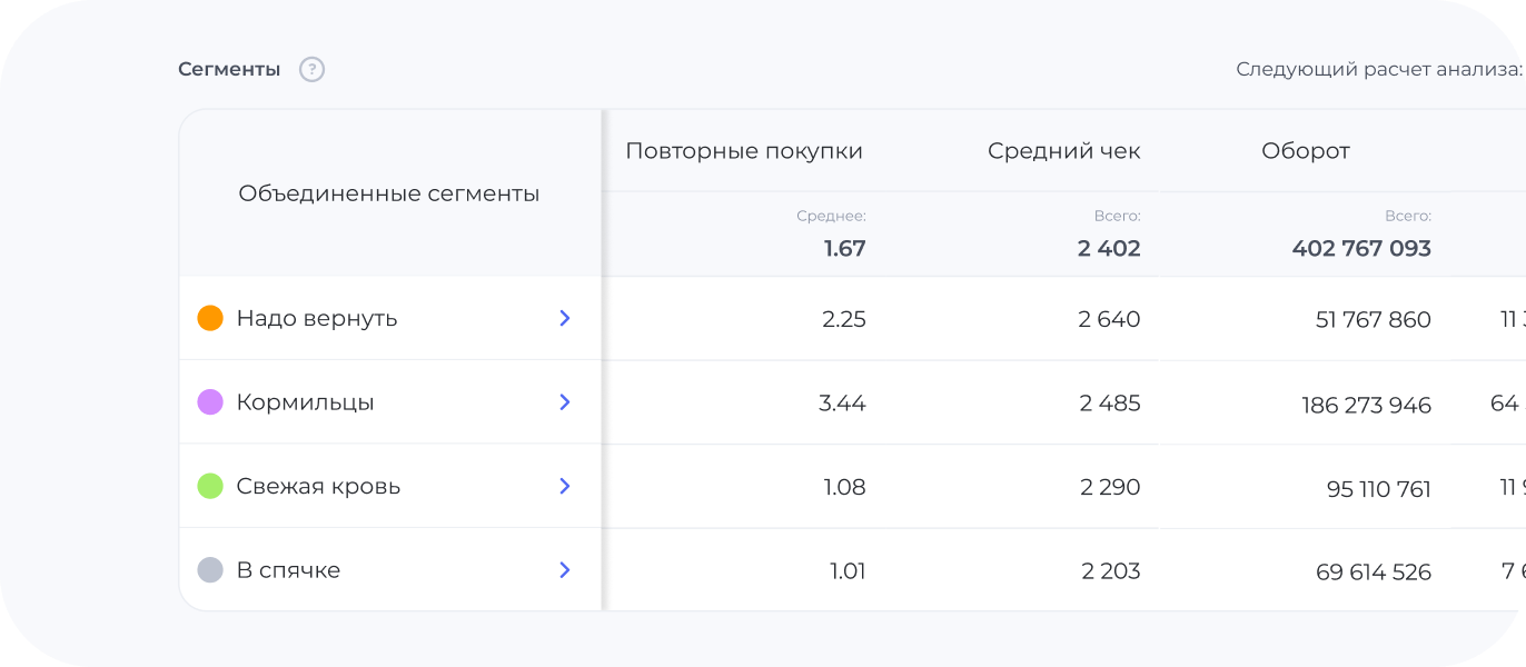 База ваших клиентов делится на группы, чтобы понять, кто из клиентов покупает у вас часто и много, кто — часто, но мало, а кто давно ничего не покупал.