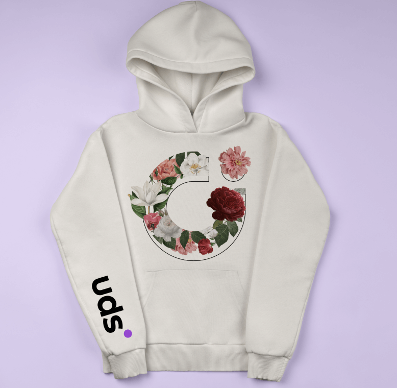 Команда UDS топит за экологию, поэтому тут цветочный принт. Да и просто красиво, сочетаем IT-продуктс нежностью цветов. На рукав добавили логотип UDS˚, чтобы на вопрос «Который час?» можно было с гордостью отвечать — ВРЕМЯ ПОЛУЧАТЬ ВЫГОДУ С UDS APP!